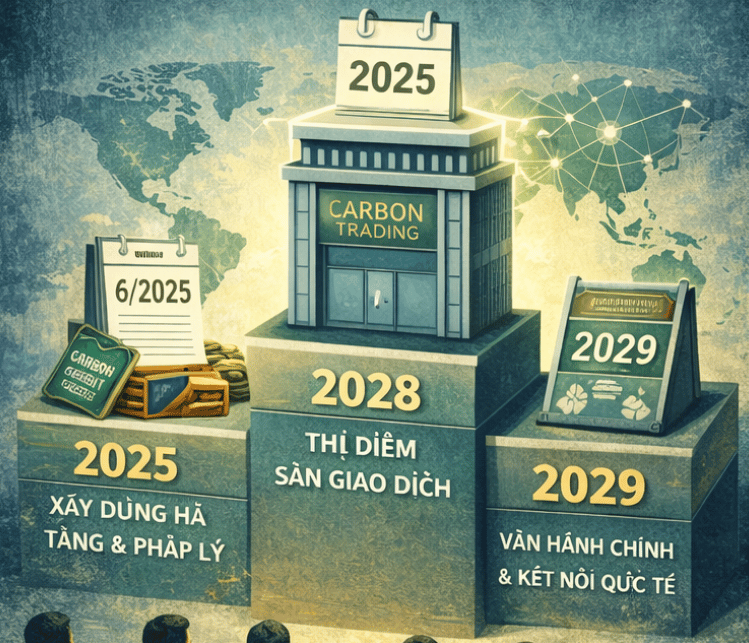 Việt Nam chính thức thiết lập lộ trình phát triển thị trường carbon theo mô hình tập trung, bắt đầu vận hành thí điểm từ tháng 6/2025 và tiến tới vận hành chính thức trên toàn quốc từ năm 2029 để hiện thực hóa cam kết phát thải ròng bằng 0 và Net Zero 2045